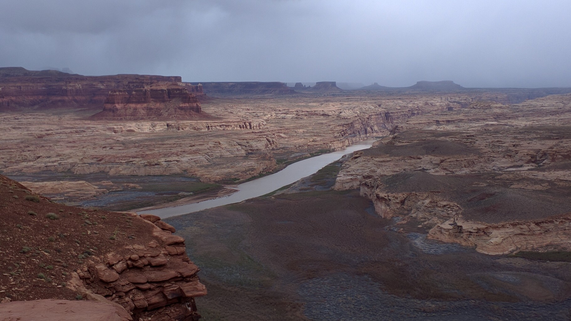 A bizarre stop on the edge of what used to be the shoreline of Lake Powell at Hite. In this north east arm of the lake the water is absent, the boat ramp high and dry. The weather closes in and we are pumelled by driving rain and rocked as the wind buffets the camper. The cloud is still down the following morning but the views looking back to where we camped are wonderfully atmospheric.