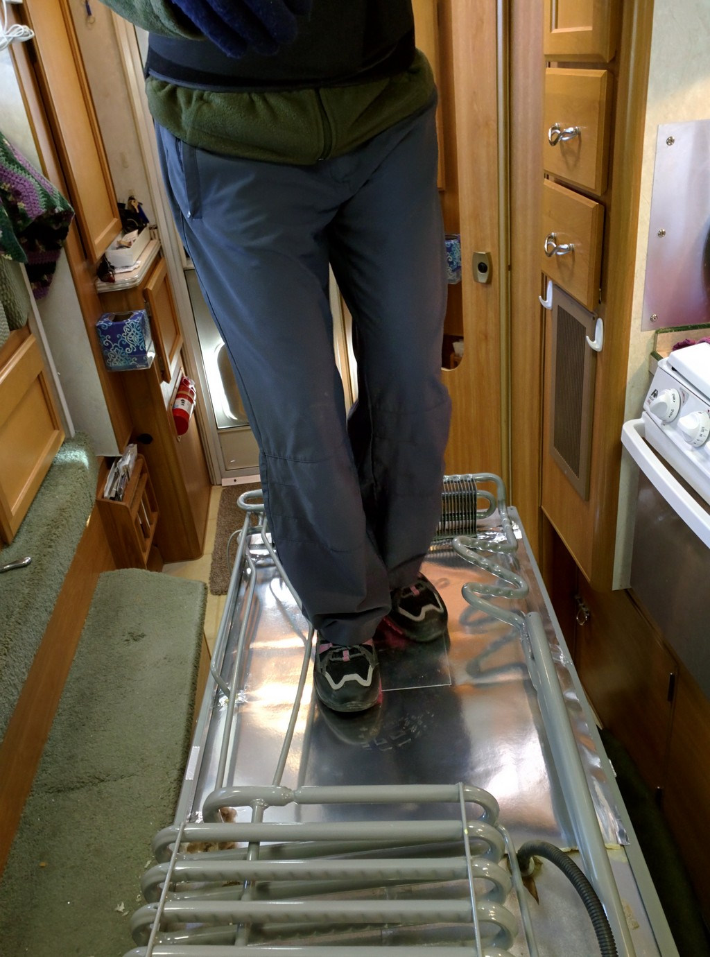 Yes, that’s the fridge on the floor of the camper and me jumping up and down on it. The fridge gave up the ghost in November and any early ideas of buying a new one went out the window as we realised the fridge is bigger than the camper door. The only way to get a new one in is to remove the slide and that’s not happening! We buy a reconditioned cooling unit and set about the work ourselves. It’s the hardest job we’ve ever done on the camper: there’s about a half centimeter clearance around the fridge. We got the better of it though!