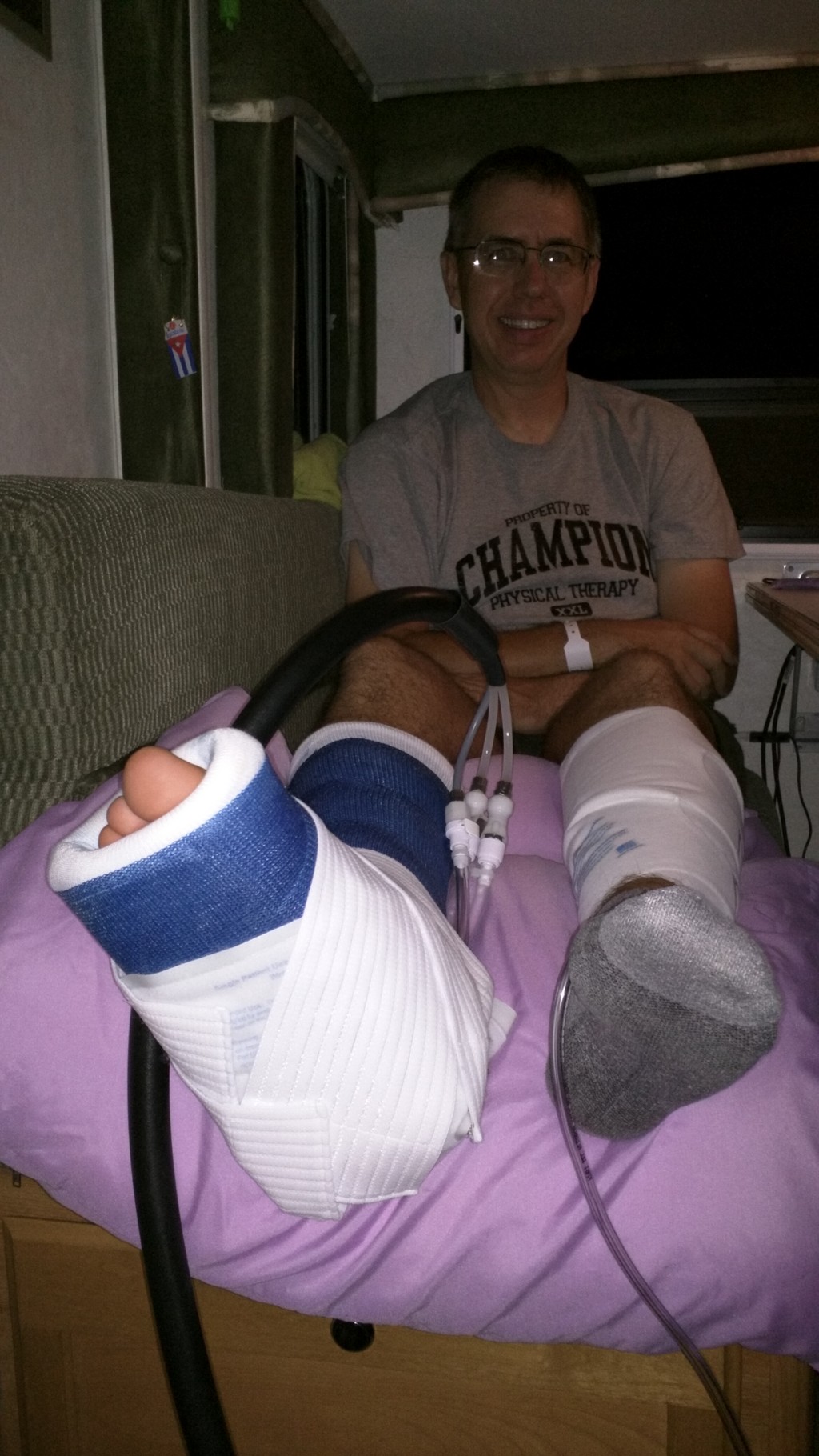 Here's Sterling post-surgery, connected to the compression machine that both kept his leg cool and cut down on the risk of thrombosis. In spite of appearances, he’s not a happy camper.