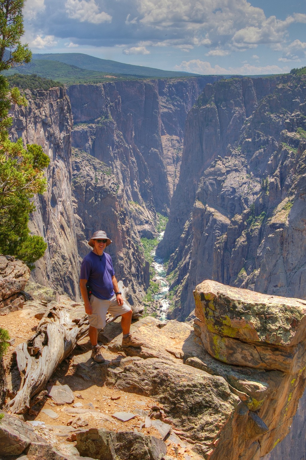 The Black Canyon may not hold its own in comparison with either Yosemite or the Grand Canyon but the combination of its sheer walls, depth, narrowness and dark rock make a significant and unforgettable statement. We’re not up to the hike into the canyon itself but rim trails give stunning views down to the fast flowing water, two thousand feet below. Staring into this abyss makes my stomach lurch and my legs weaken momentarily. Other members of the party are not affected and get far too close to the edge!