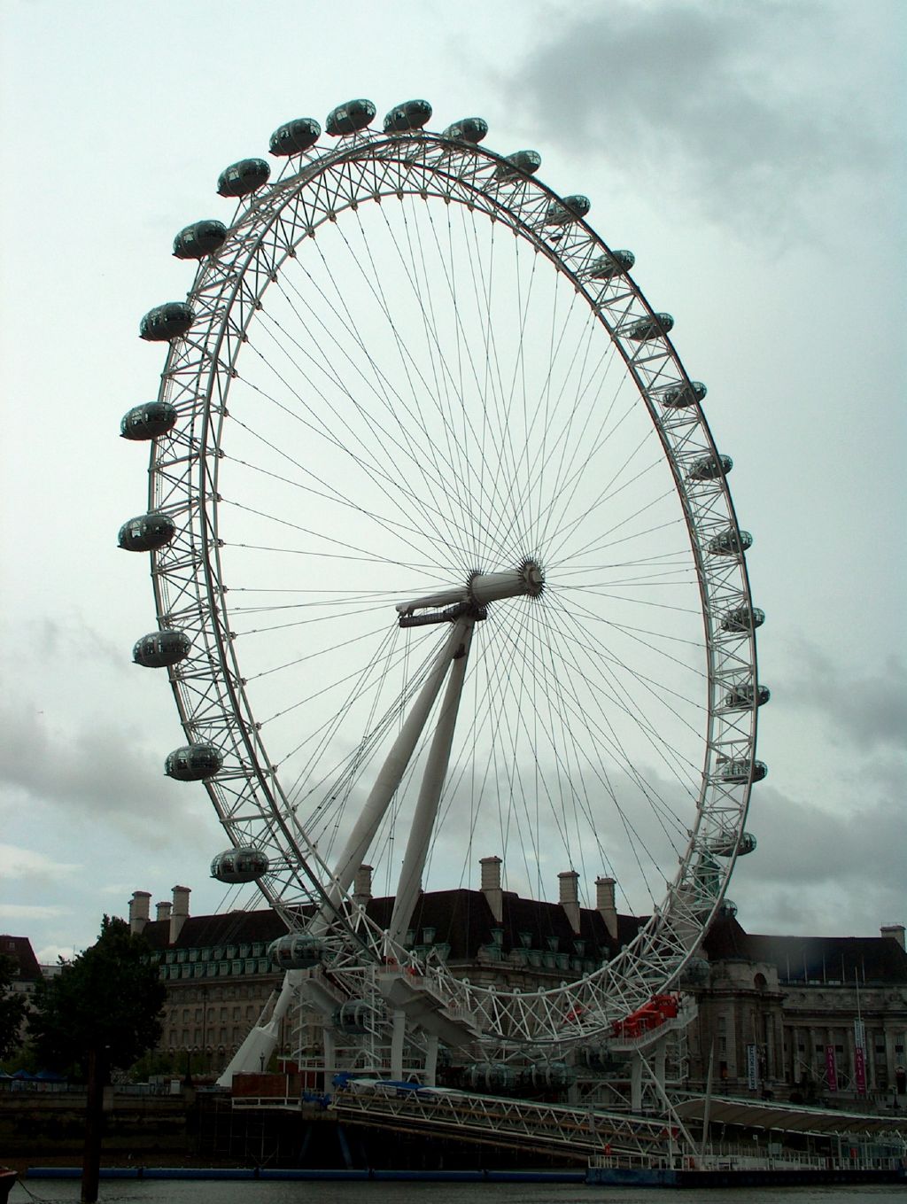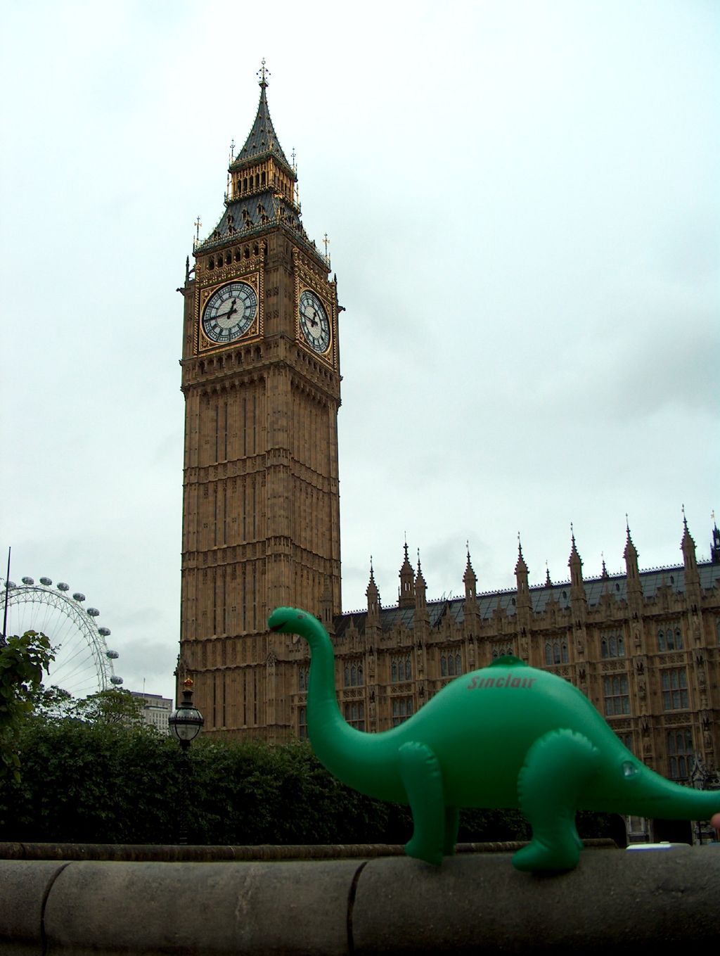 The next day the weather had cooled and intermittent rain settled in. Ah, very good, much more English. So naturally, we set off on a boat trip up the Thames to see some of London's landmarks that I had missed on previous visits. And having delegated navigational duties� I wouldn't say we got lost as such, but we did, umm, miss our stop. Worked out OK, though, because we actually got more boat ride than we'd paid for, and got to see the London Eye, newly built since we were last here. The Eye is essentially a giant Ferris wheel, built for the Millennium celebration, but its construction makes it look more like a 450-foot bicycle wheel. We're going to have to come back and ride it, but since one major reason to do so is for the views, a rainy, misty day isn't the best choice. Next time we're in town, maybe.