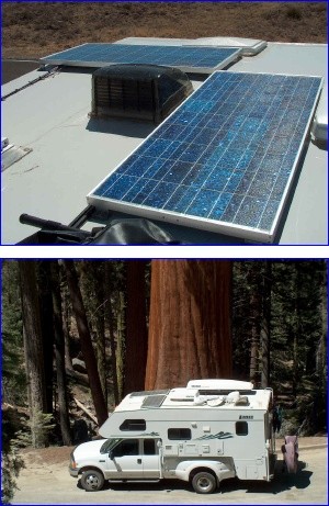 When I wrote my original solar article, we had two 120-watt panels on the roof, mounted in a location I wasn't very happy with. So the first obvious change was to move them to the front corners of the roof, where they should have been in the first place. This way they'd be out of the considerable shadow our DataStorm casts when deployed, and would free up more usable roof space as well: specifically, the problem with the original mounting location was that it blocked the only roof area where an air conditioner could be installed. So back in April 2003 when we came to install an A/C, one panel was moved. You can see the result in the bottom photo at left; the panel in question is the one that was in the foreground in the top photo.