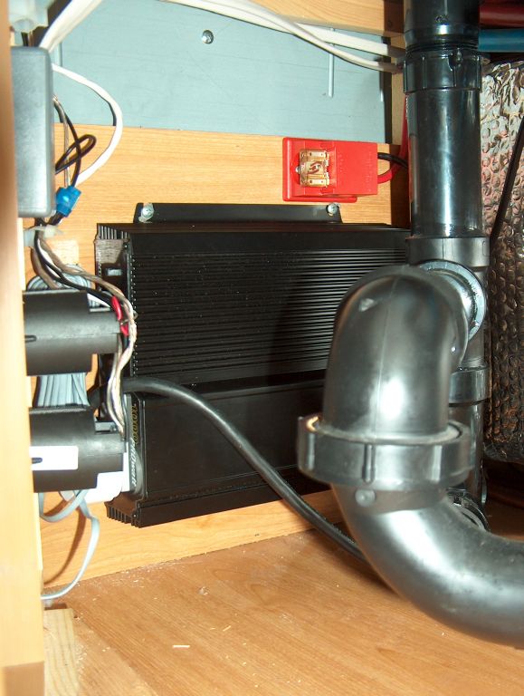The inverter itself is mounted in the cabinet under the kitchen sink, very near where all the camper's wiring comes together. It's a tight but acceptable fit, and it minimized the run lengths for all wiring involved.