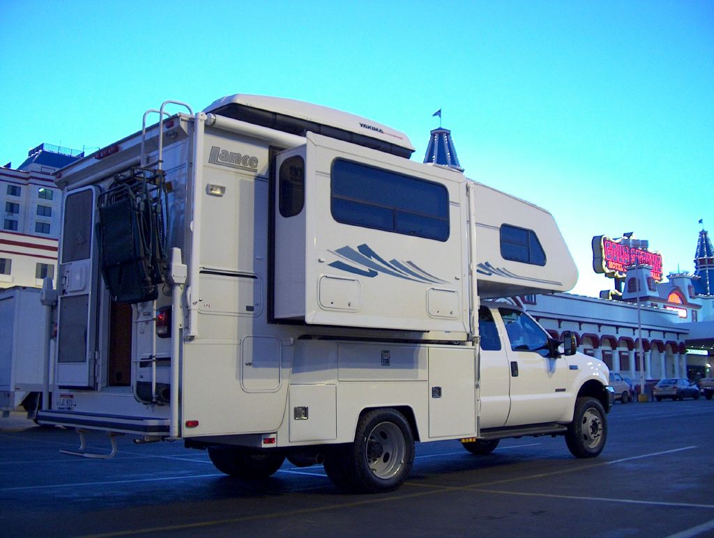 Now the bad news… It turns out that Douglass has seriously munged the wiring of the camper's electrical connection. We made it about 10 miles up the road before we realized this, and now we're stuck in a different casino's parking lot for the night rather than go on with no turn signals, taillights, brake lights, etc. What happens is, using the brakes or either turn signal makes EVERY light on the camper come on. In Teresa's words, "It's like Christmas back there!" We're hoping that the camper's electrical systems haven't been damaged, but it's too soon to tell. I'm going to crawl under the truck and have a look at redoing it in the morning.