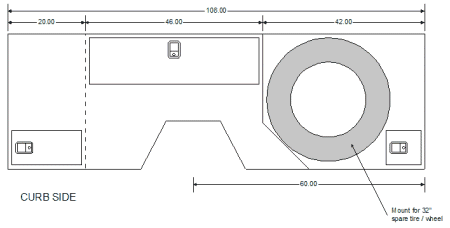 We're not quite clear why, but it's Saturday before we get it, and since we can't call him we come up with another harebrained solution of our own: what about a narrower box on one side of the truck, and we'll hang the spare on the outside? A bit of a kludge, but it has some appeal to me - that's a cool look, sortof like an old Land Rover crossing the Serengeti with a spare on the hood. But the bottom line is that we consider a spare tire to be a necessity. I draw up some designs.