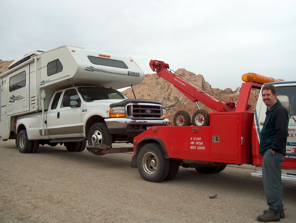 So we've set off for Denver in our old truck. What else could we do? But in the middle of Utah, halfway down the 3000-foot San Rafael Reef, the F-350's transfer case gives up the ghost. Fortunately, we're in one of the few places in rural Utah that has a bit of cell phone coverage, and our insurance's Roadside Assistance plan is called upon. Best $4/year we've ever spent - within the hour Bo of Interstate Towing shows up, hoists our rig onto the back of his old F-450 (really!), and pulls us into Green River.