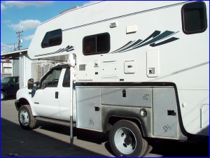 At this point, I'm quite liking the look of the Rawson-Koenig U60D88 utility body. Claimed to be the same height as a pickup bed's frame rails (19"), this DRW body has a 59"-wide bed (should be plenty). but an overall width of only 88", which I think is narrow enough to fit within the Lance's tie-down points and buttresses. I need to do some measuring. They're also nice enough to put the weights of their bodies on their website - this one is 1147 pounds! I put together a list of questions for Rawson-Koenig, to be asked as soon as we get close enough to a cell phone tower.