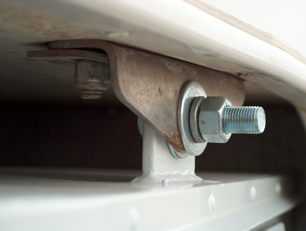 More important is that the tiedown system definitely needs work. The front ones are fine, they use two of our old Happijacs between loops firmly welded onto the body and eyebolts we put on the front jack brackets. No, it's the rear system that we need to improve; it consists of two more welded-on loops that, when lined up with our camper's existing rear tiedown points, allow a bolt to be put through to secure everything. The problem's in the "when lined up" part; the alignment of these has to be nigh-perfect for the bolt to go, and that level of perfection is nigh-impossible.