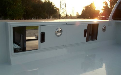 So, what if we had a truck with two-foot-deep storage boxes on each side of a flat, four-foot-wide floor? Perfect – no wasted space. This is exactly what we had built, a custom version of what the truck body industry calls a utility or service truck. Not surprisingly, I'm not the first to think of putting a camper on one. What does surprise me a bit is how few people do it; in twenty-one months of roaming the USA and looking at truck campers, we've only seen two or three such arrangements.