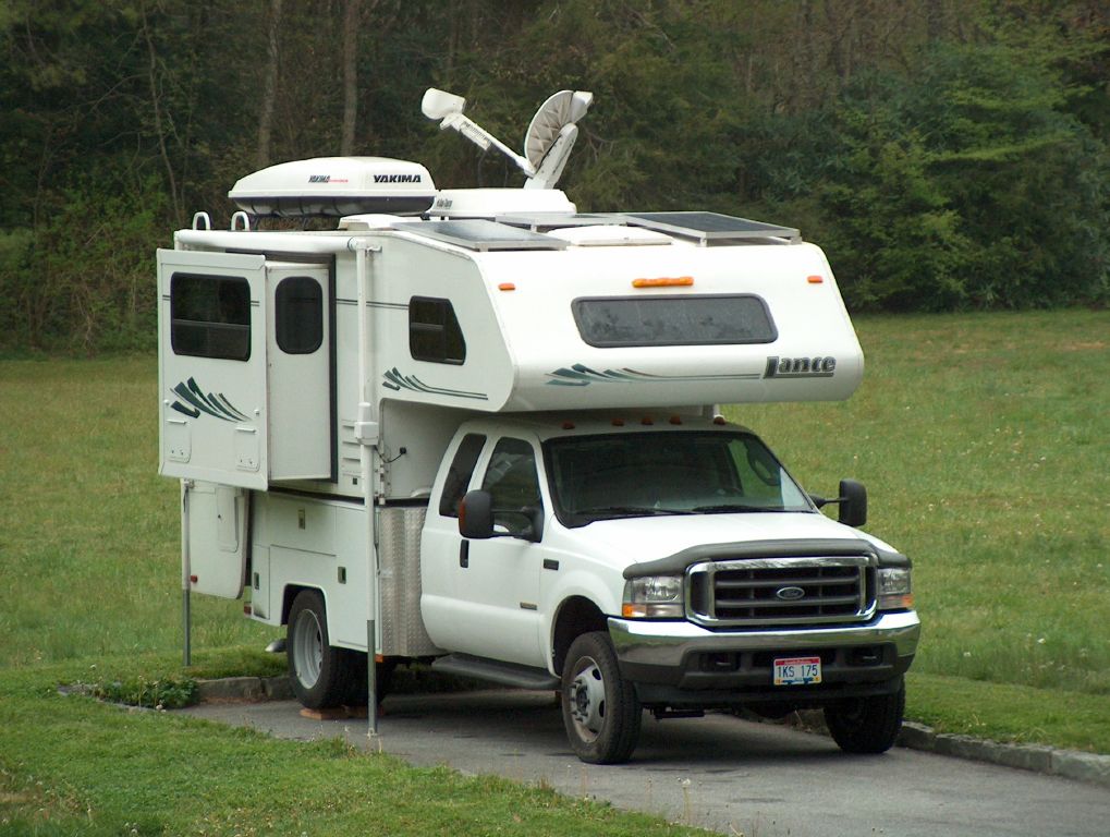 For the 2005 model year, Ford has introduced a new coil-spring front suspension on the SuperDuty trucks, replacing the leaf springs that we've had on both of ours. One consequence of this that I envy is a significantly tighter turning circle, down from our expansive 58' to a more-reasonable 44'. But this new front end is also stronger, contributing to higher GVWRs for the entire lineup, and I believe that this has changed the camper-carrying landscape significantly. First, the dual-rear-wheel F-350 is now rated for 13,000 pounds, enough for virtually any stock camper, even including optional equipment and cargo. And than there's the new F-450, with a GVWR of 16,000, enough for our big utility-body-equpped, fulltimer-loaded setup. Admittedly, such a truck would have less margin than our F-550, but I suspect the taller final-drive-ratio would be worth the tradeoff, and if we were doing it over again, I think that's the route I'd go.