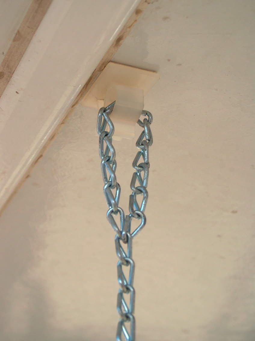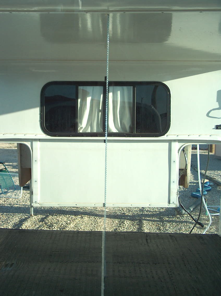 As you've probably worked out by now, this system is based on aligning the centerlines of truck and camper, and all the bits we've stuck on are just visual references to aid this process. The niftiest bit is the lightweight chain hung from the clip under the camper's cabover; chain was recommended to minimize the effects of a breeze. This chain is also the only part of the system you'll remove after you've attached camper to truck; the rest stays in place all the time.