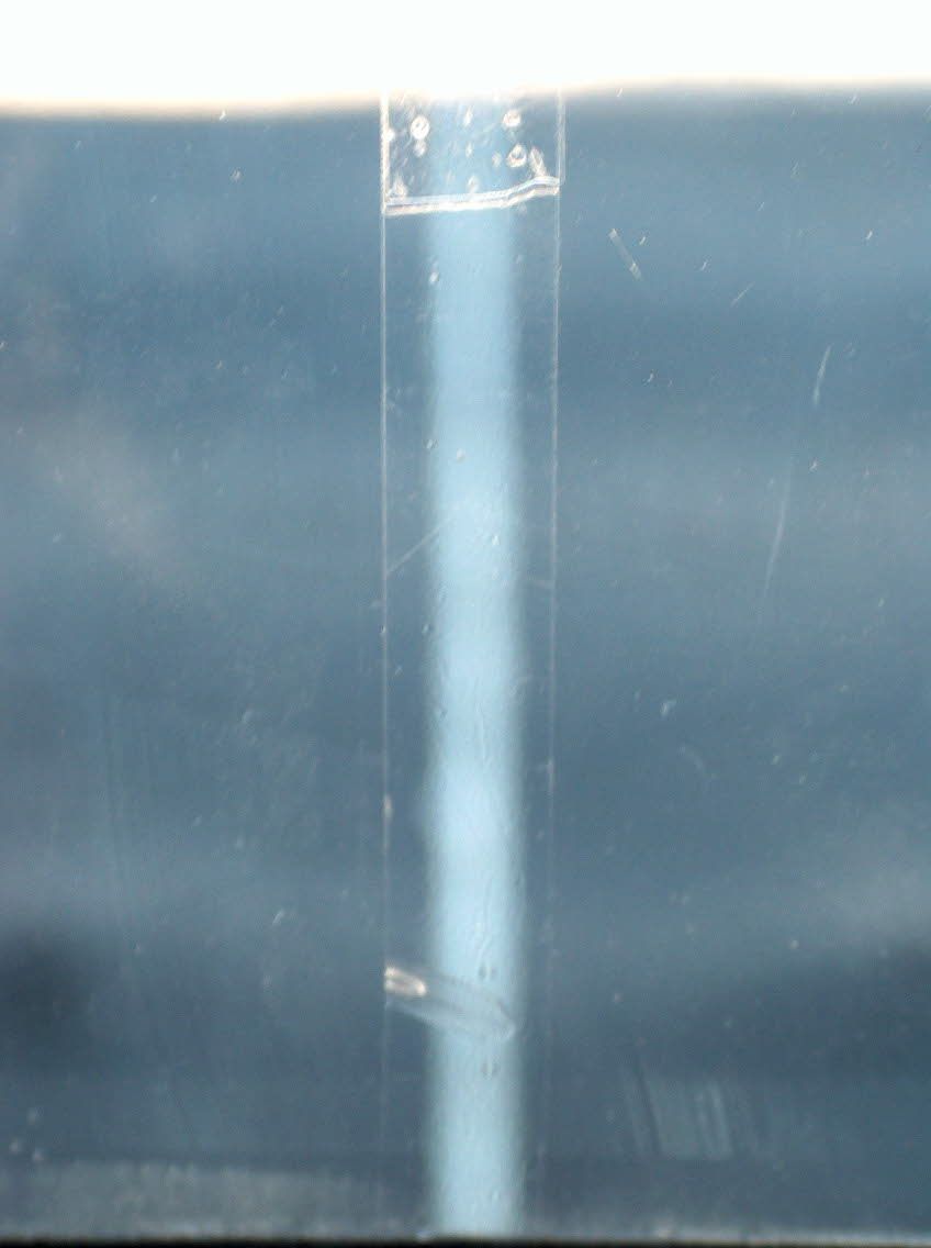 So, once you have the truck generally in position in front of the raised camper, turn around in the driver's seat and look out the back window. By sighting through the transparent tape and along the line down the middle of the bed, you're looking directly down the truck's centerline; you'll know you're aligned correctly in front of the camper when the chain is hanging exactly in front of the electrician's tape marks. It should look something like this: