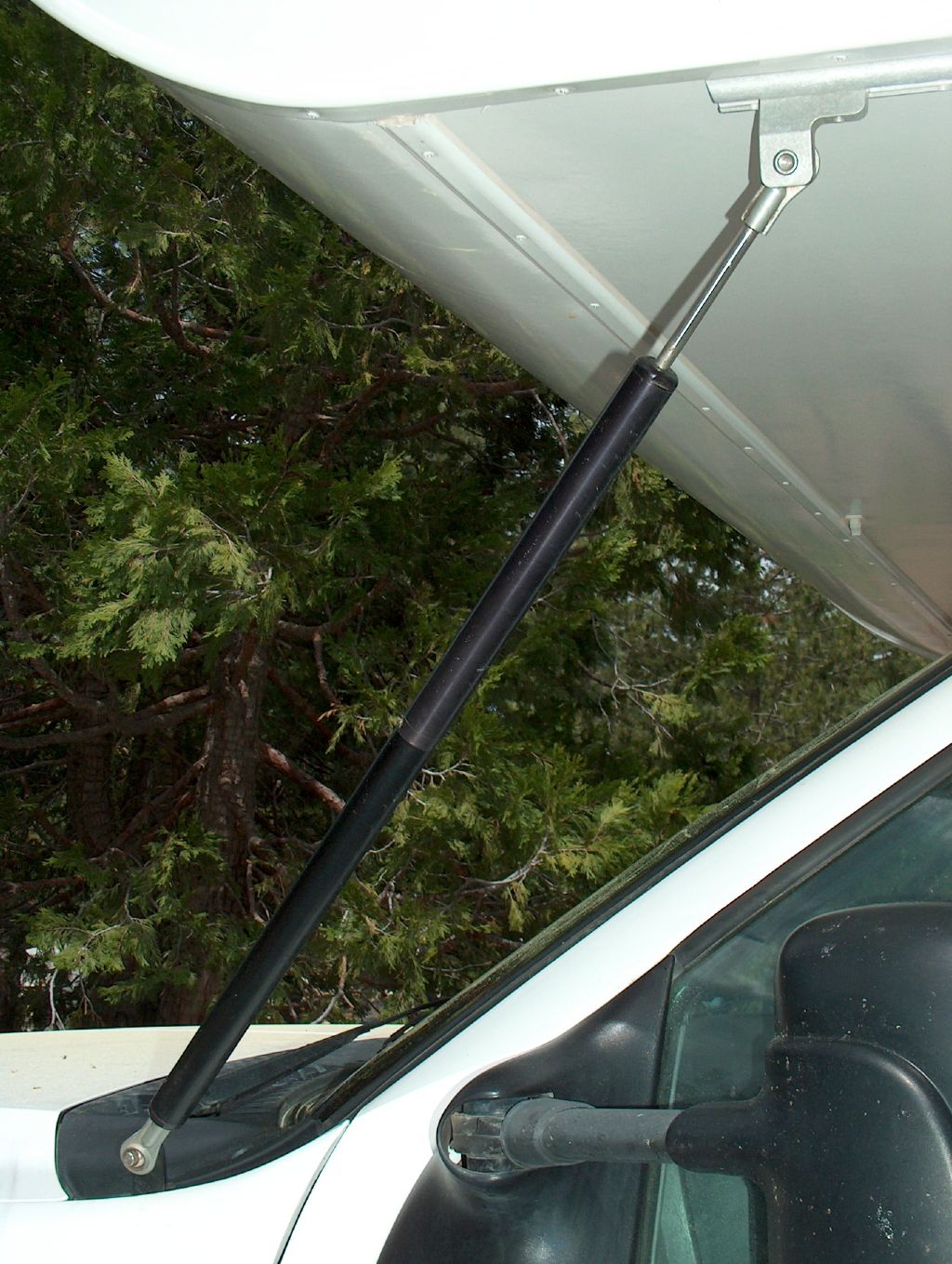 Our final attach point is the cabover struts, basically little shock absorbers between the front ends of camper and truck. They don't support any weight; their job is to dampen relative motion between the camper and the truck's cab. This motion comes from the frame flex I mentioned earlier, plus the fact that the truck's cab is mounted to the frame on rubber bushings. In short, the struts decrease wobble and thus increase our overall stability.