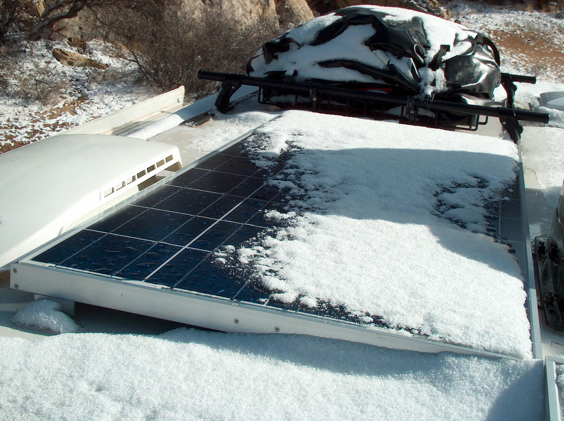 Allllllllrighty then, now we're getting to the real issue: power. How well do our solar panels do the job they were purchased for – supplying me with enough electrons to earn our living? To be honest, they're not quite up to it so far. The laptop computer and satellite modems draw about 6 amps every minute they're on, which in a full workday amounts to about 50 amp-hours. Add another 20Ah or so a day for lights & such in the camper, maybe another 20 for the furnace at this time of year, and about 10 for the camper's phantom loads (fridge electronics, LPG and CO detectors, etc). That pretty well accounts for our 105Ah battery in only one day. And being winter, we're just not getting that much charge from the panels – maybe 60Ah on a clear day. Maybe. Throw in a bit of recreational computer use in the evening (like watching a DVD, surfing the 'net, or me writing this article), and we're way over.